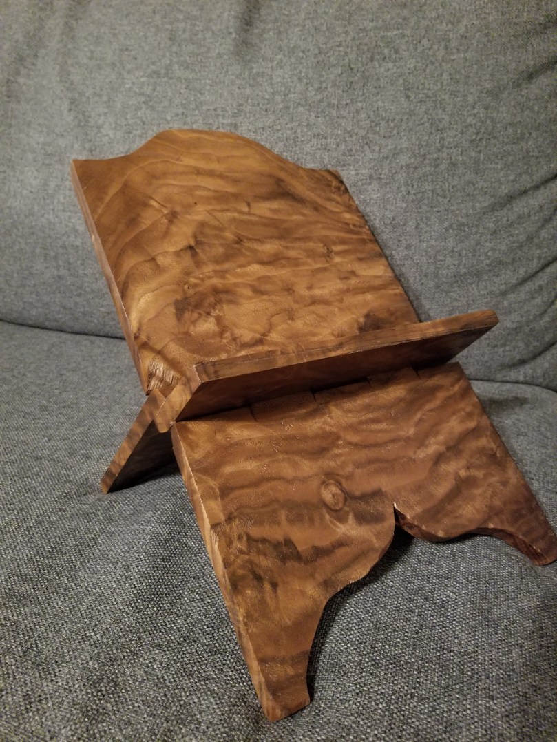 While I’m working on my first furniture build, I thought I’d provide a short overview of a recent project I did for those who visit this site. This is a folding bookstand, crafted from a single piece of walnut using only hand tools. It was designed by Andre Roubo in the 18th century, but I came across it on an episode of Roy Underhill’s show “The Woodwright’s Shop.”