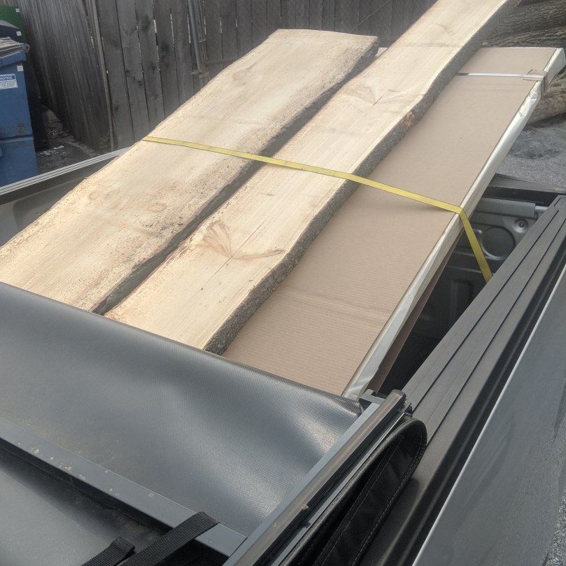 The first thing I did was buy high quality lumber, from a lumber yard. Pictured are sheets of white pine veneered, 3/4 inch plywood and slabs of 2″ thick, locally cut white pine. I ended up needing one extra slab. This stuff is kiln dried; when pine is fully dried, it’s really stable, unlike the hardware store stuff that has to continue drying out. If you absolutely can’t find a lumber yard that carries white pine, you COULD use construction lumber from a hardware store. If you do, buy it a couple months early and let it sit in your basement to dry out. It’ll warp, but better to do it BEFORE you surface everything than after it’s built.