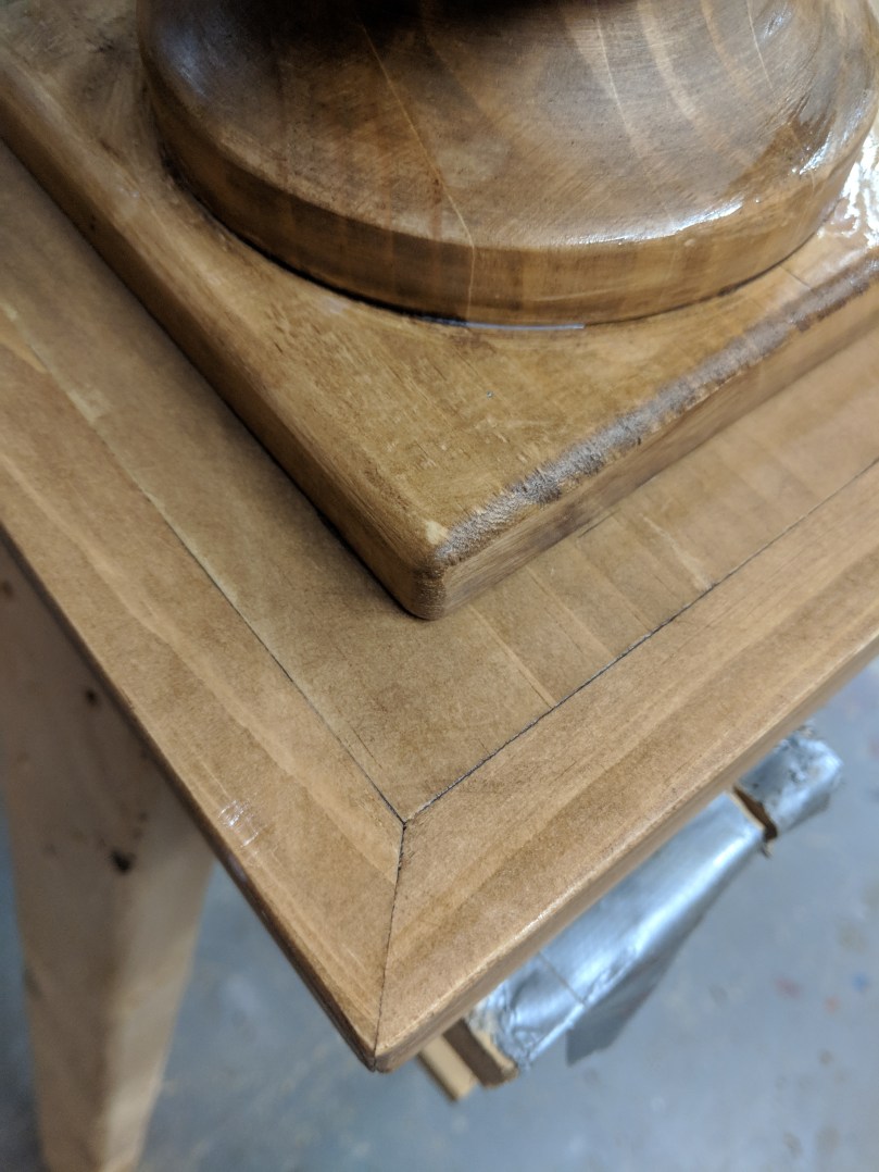 For the stain, I used General Finishes Antique Oak. It’s a water based stain, which reduces the blotching that pine characteristically shows when stained with oil stains. The pockets of pitch and sap in the pine become dissolved by the oil solvents, and you get uneven coloring. With water-based stain and poly, this is almost eliminated.