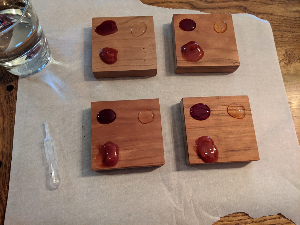 Osmo Polyx Oil (Top Right): This finish also performed really well. I found no noticeable damage to the sheen from the wine, water, or ketchup. No staining at all. I recommend this finish for all woodworking projects. I need to get a better feel for how to apply this finish. It seemed to be quite thick, and was brushed on, but I believe there are quite a few more ways to apply it depending on the project.