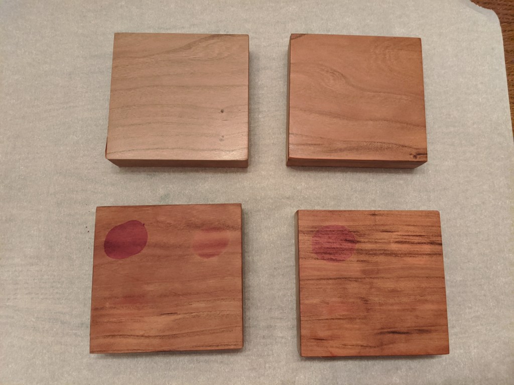 To avoid repetition, the parameters were exactly the same as the last test: same board of cherry, same procedure for applying the finish (by that I mean, specifically to each manufacturer), and the same liquids being tested on the finish. The one exception is I decided not to retest with acetone; only the lacquer failed last time, so it seemed unneeded.