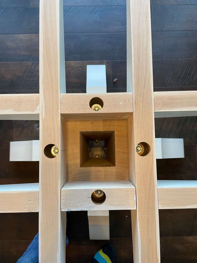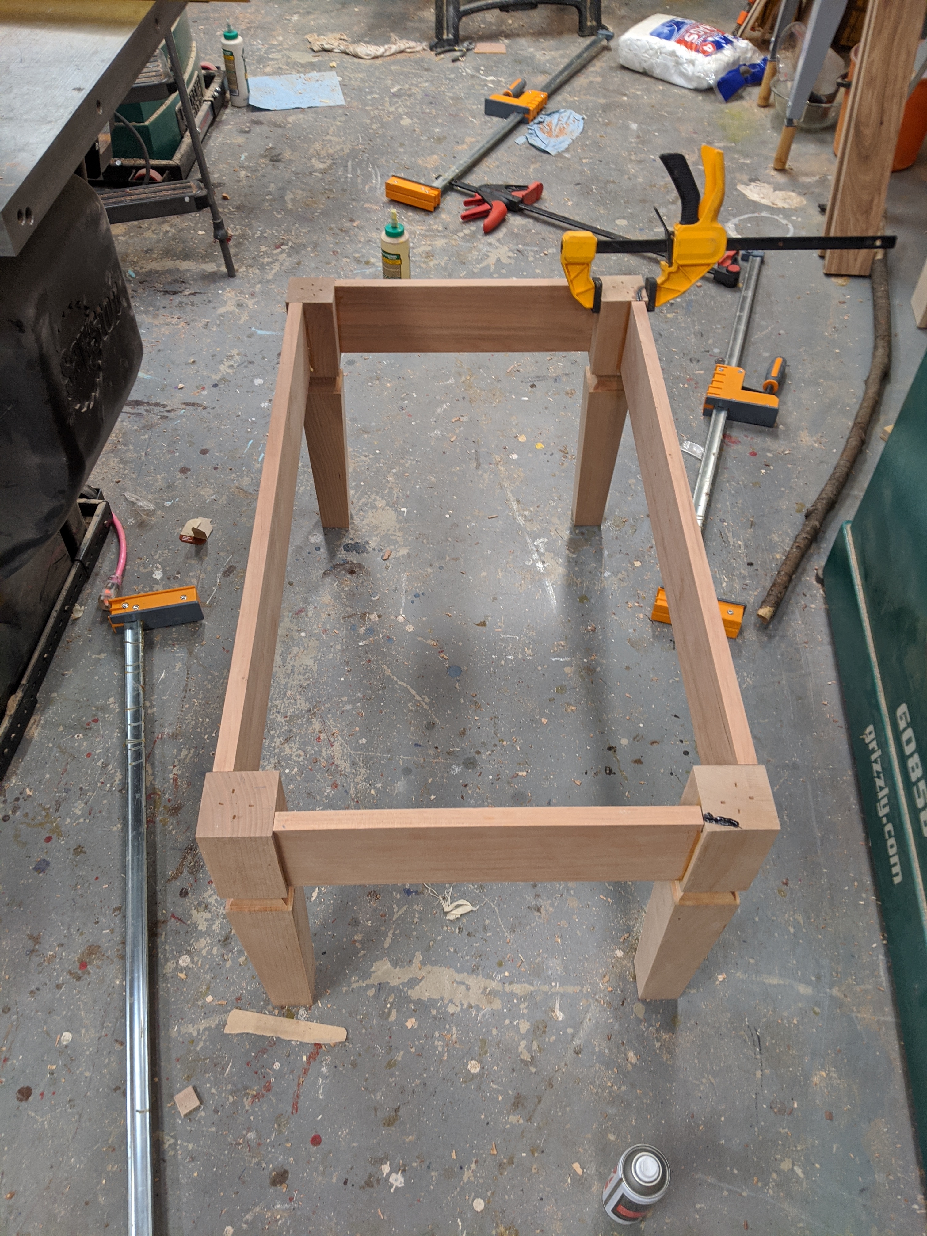 Building the frame is relatively straightforward, and again very similar to how I built the frame on the full dining table. You’ll want to finish your stock down to 1.5″ thick and 3.5″ wide (nominal 2×4 dimensions). I chose to go with hard maple because it’s strong, paints well, and it’s what I had on hand; for the purposes of this build, you could easily just use 2×4 pine from HD or Lowes. Just make sure you buy dry, dead-straight wood with as few knots as possible.