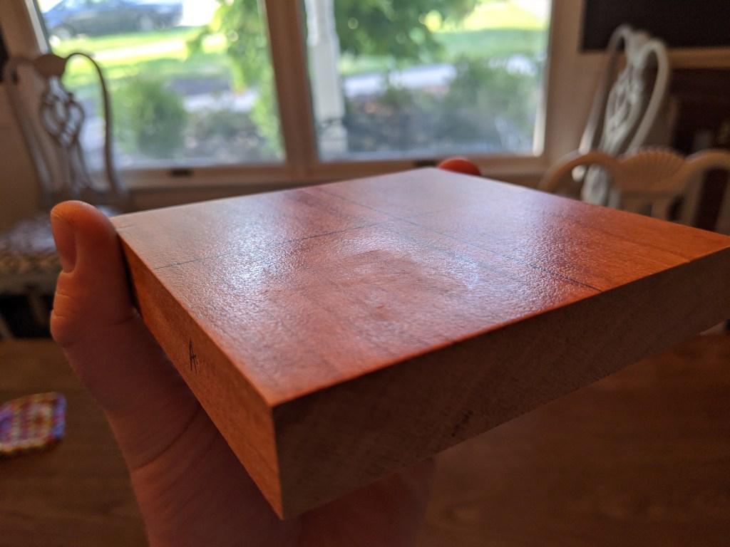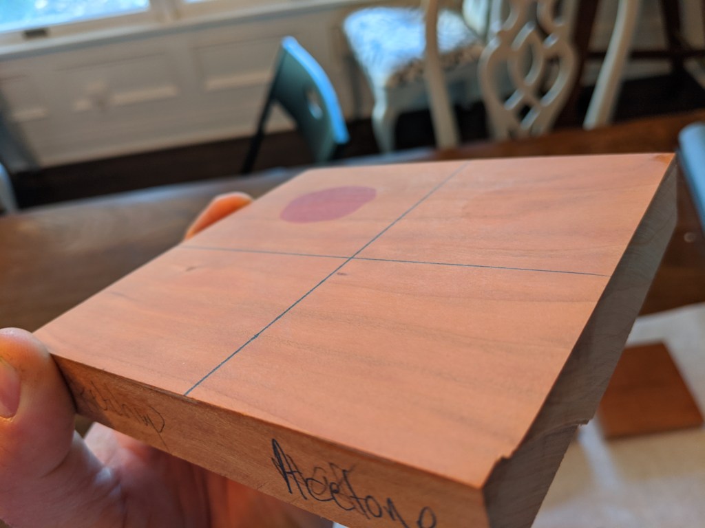 The base was 8″ square at the top; verify this in your own case as a 1/16″ difference can make the joints difficult to fit. What we want to do is mark 4″ off the center mark in each direction, giving us the outside edge of our lap joint. Then, taking a piece of our wood, trace the 1.5″ width toward the center mark. We now know where we need to cut to make the joint work. Repeat on all 4 boards.