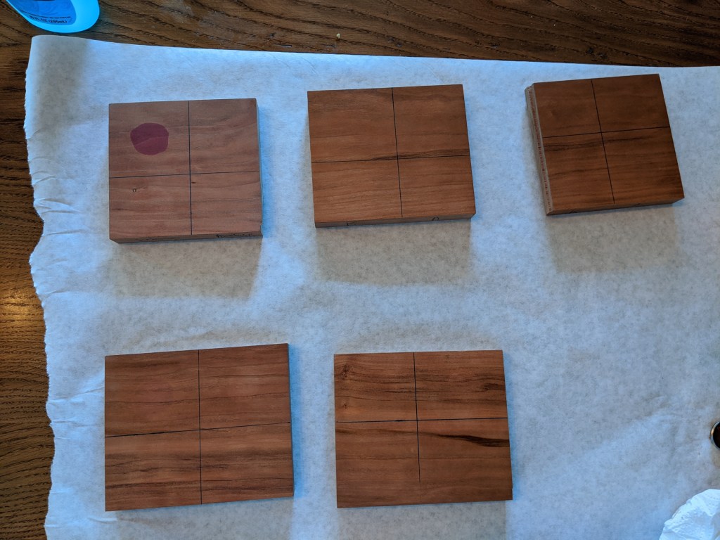 Cut 4 boards to identical lengths, and then mark the center of each one across all 4 faces of the board. This way, we will know where to locate the bolt holes and have a uniform center.