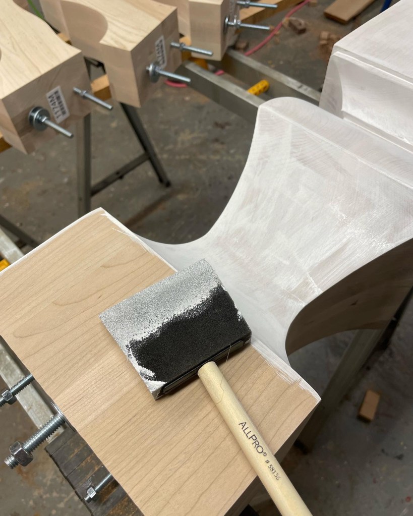 Two coats of primer are ideal; you’re going to need 4 coats of paint total anyway, and I find a 2/2 for primer and top coat works better than a 1/3 split. Apply coats lightly and let them fully dry before lightly sanding with 240 and then 320 grit paper. These Festool sandpaper pads are amazing, and probably the only affordable product they actually make at 50 cents per pad when you buy them individually at Woodcraft.