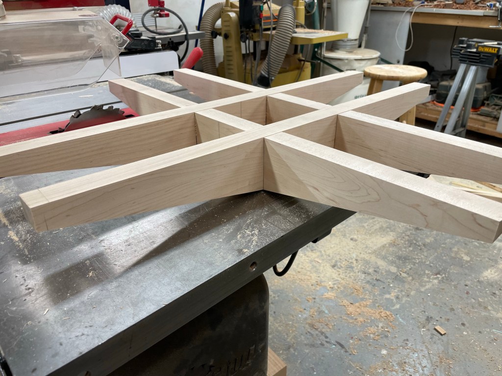 How long your frame supports are depends on how wide you’d like your table to be. I made my table 48″ in diameter, so I chose to go with 30″ long supports; the extra 18″ of overhand leaves room for chairs and, coupled with the bevel I put on it will avoid hitting anyone’s legs.