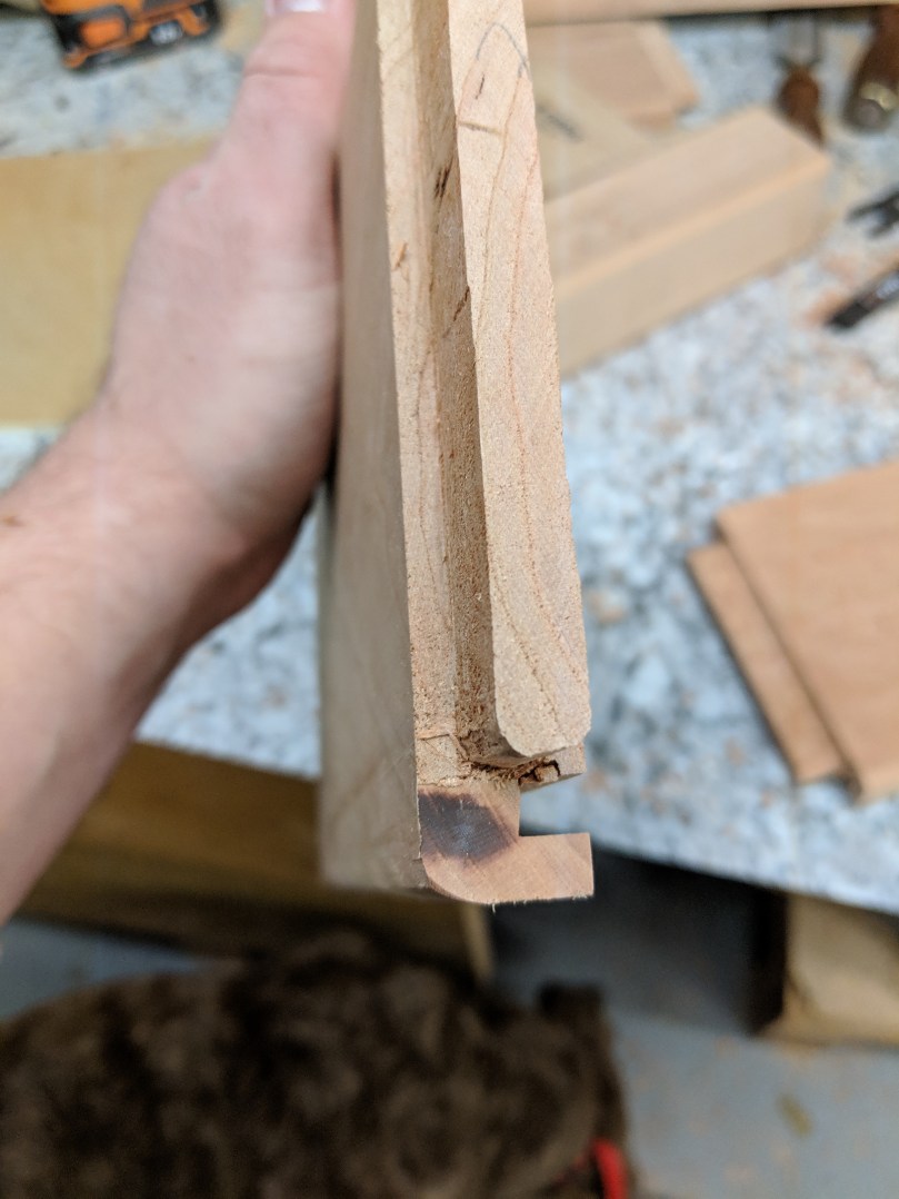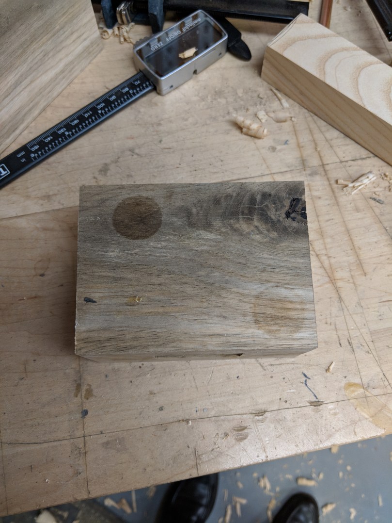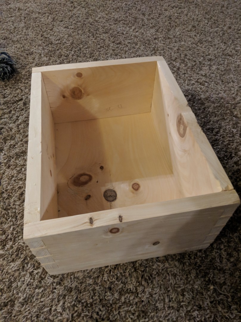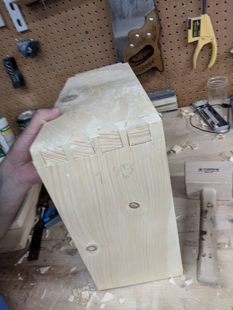 The second issue I noticed was that the author mentioned the sides needed to be dovetailed together, but then proceeded to use what I guess would be called large finger joints? This is an important distinction, because while a finger joint can be strong in modern joinery, it’s only strong because of the large amount of glue area. Modern glues are very water resistant, but Civil War era glues would have been made from cow hide, and water soluble. Meanwhile, the historically accurate dovetail joint gets all of its strength from geometry and does not rely on glue at all! You can see the trapezoidal shape of the dovetail in the first picture above where the wood has chipped off.