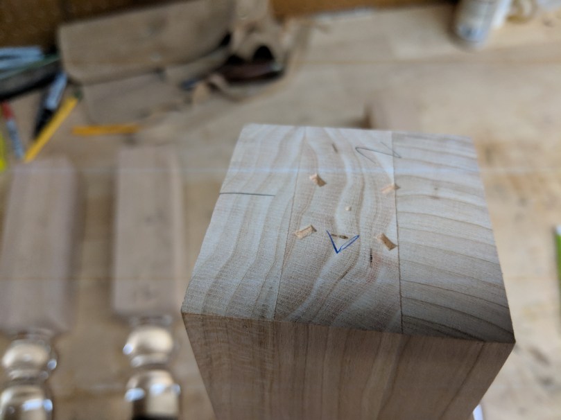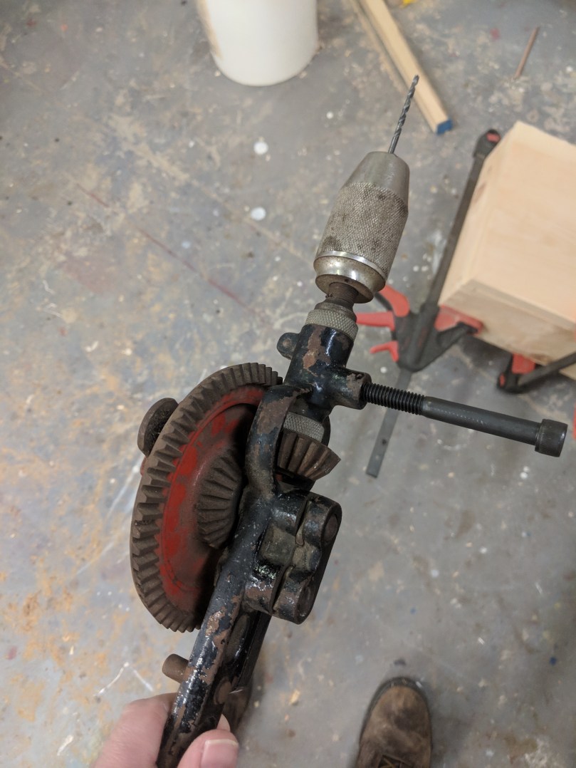 For the sake of “hand tools only” I went and bought this old egg beater drill off Facebook Marketplace. It was about $15 and, though it didn’t come with bits, readily accepted a normal brad tip drill bit. A brace and bit setup would likely be more accurate, but my brace only has auger bits, which would be too large.
