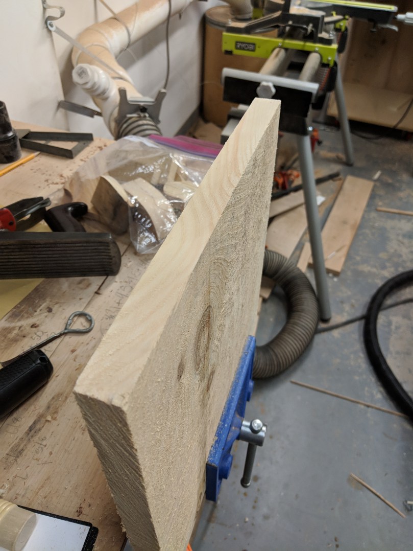 Now that you’re almost at the width you need, you’ll need to surface both faces flat and parallel to each other. If you have a woodworkers bench, you can use the various clamps and vices on there to hold the board. I just have a regular work bench, so I needed to make bench hooks to help hold the piece while I plane it.