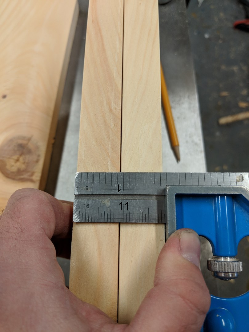 Now we need to know how thick our sides will be so we can measure the final length of the boards. The best way to do this is put each pair of opposite sides together, measure the total thickness, and then add this to the adjacent length (width) depending on which set you’re measuring. In this picture, my long sides measure about 1 and 13/16ths thick. So, my short sides (10.75″ interior width) need to actually be 10.75+1 & 13/16th long. This is to account for the dovetails (this will make more sense soon).