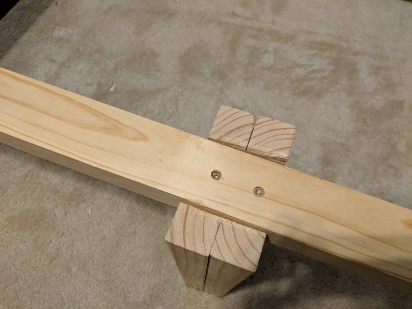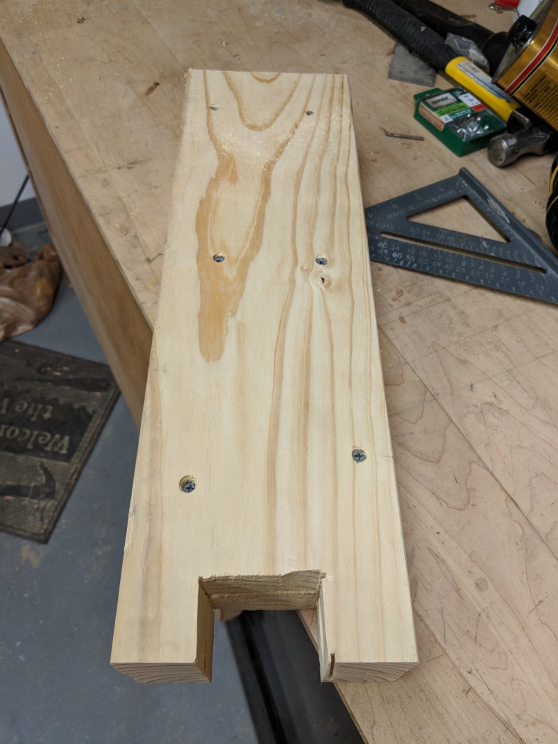 Once that’s together, you want to create two support legs to go under your center support.  Use whatever you have in your shop.  I decided to take some more yellow pine, screw two pieces together to add some thickness, and then notch in a spot for the center rail.  The measurement for the leg height should be the same as how high your center bracket is; 18.25″.