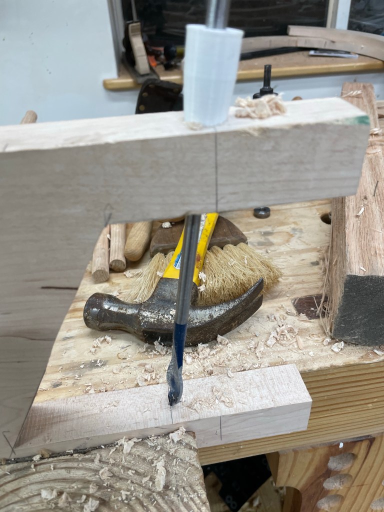 Spindle Boss is primarily used for aligning arm and seat mortises. The arm hole is drilled by sighting toward a mark on the seat (see Chris Schwarz’s methods in his many publications.